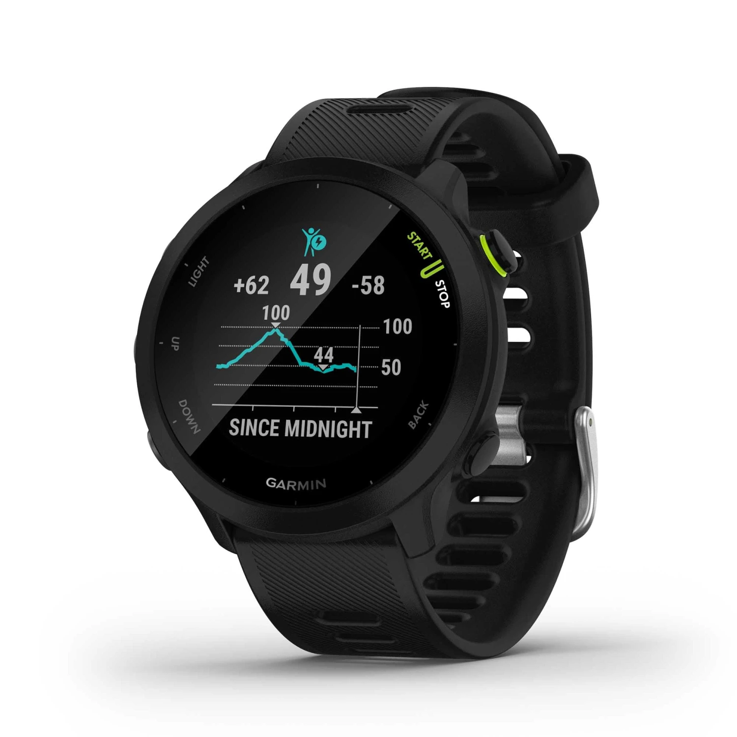 Perfect for new and experienced runners alike, the Garmin Forerunner® 55 is an easy-to-use GPS running smartwatch, designed to enhance your running and active lifestyle. Straight forward to set up and go, simply start your run or walk with the press of a button and track your time, distance, speed, pace and heart rate* direct from your wrist.