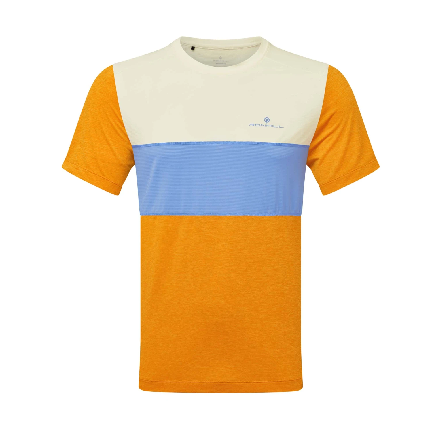The men’s Ronhill Tech Trio S/S Tee in Spice Marl resembles a classic heritage running top. Tri-coloured panels on the front have a soft pastel effect. Further playing into the look and feel of what club runners wore in the past. This wouldn’t look out of place when the late Ron Hill was clocking his biggest mileage weeks.Â